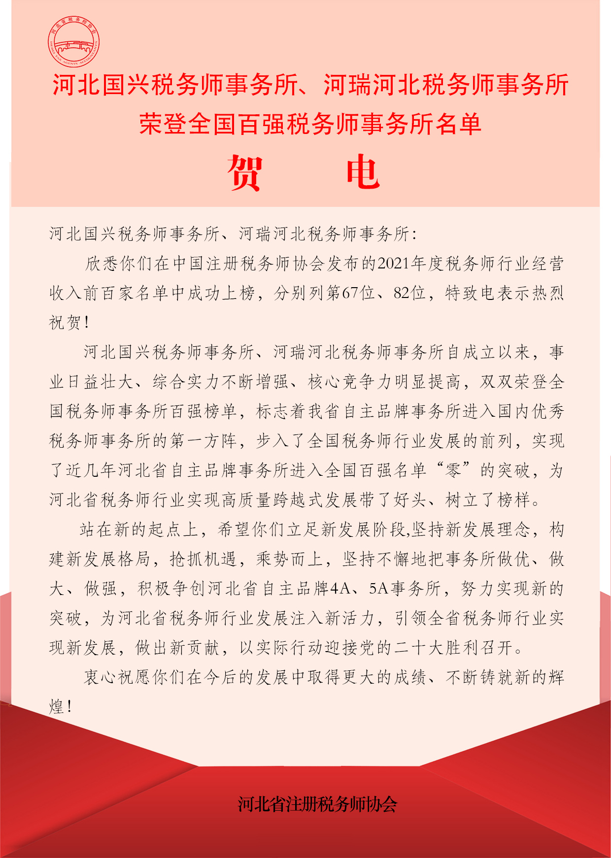 賀電!河北國(guó)興稅務(wù)師事務(wù)所榮登全國(guó)百?gòu)?qiáng)稅務(wù)師事務(wù)所名單